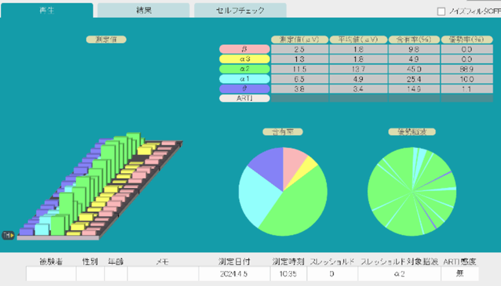 円グラフ(右)は3分間の優勢脳波の移り変わりを表しています。棒グラフは2秒ごとの各脳波の電圧を表しています。結果では、平均値と優勢率をみます。定期的な測定をお勧めします。